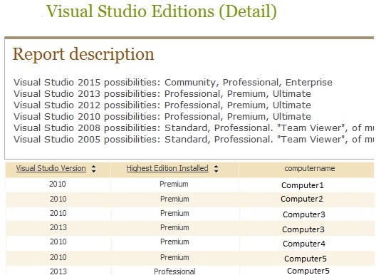 which could help you make a report like that could look like this. Computer names have been changed, but note that Computer3 and Computer5 have two versions of Visual Studio, and then their editions:
